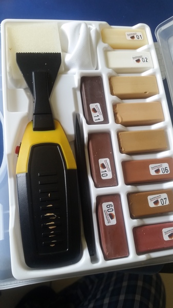 Eu reparo os laminados aqui de casa com uma cera que derrete e ao arrefecer toma a forma do defeito e para terminar passo uma espátula plástica para retirar o excedente.